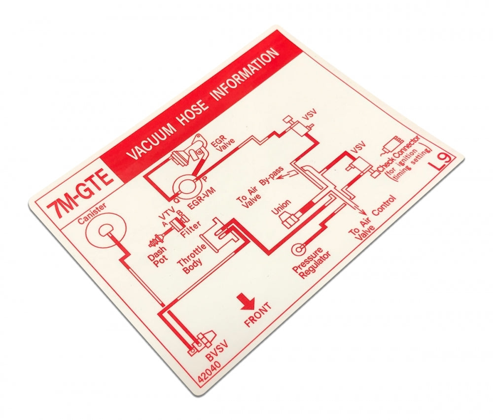 Reproduction Vacuum Hose Information decal as found on Toyota Supra MA70 fitted with 7M-GTE engine, this has been meticulously reproduced based off an OEM sample and sized on an original car. Printed on premium vinyl, proven to last in the outdoors.