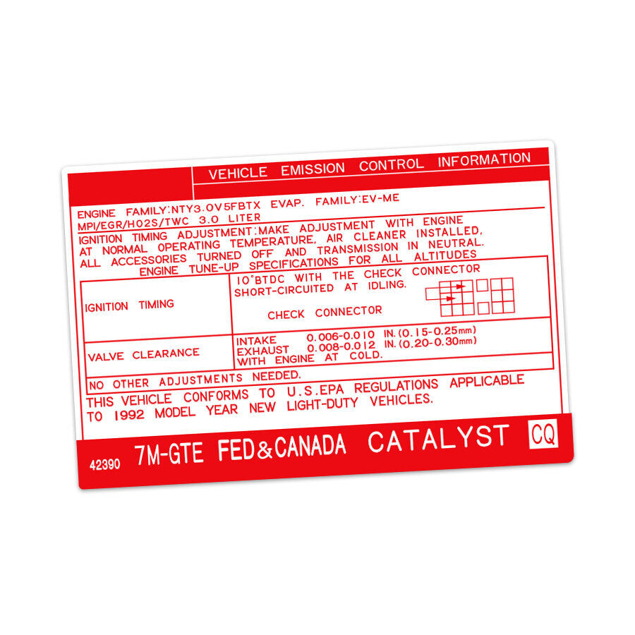 Direct reproduction decal depicting the emissions information as found on the TOYOTA SUPRA A70 (7M-GTE) (USA/CANADA) (1992). Meticulously reproduced off an OEM sample with a